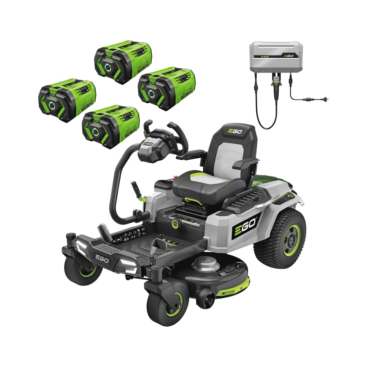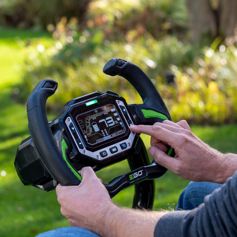 The EGO Z6 ZT4205E-S features the industry’s first e-STEER technology, delivering intuitive steering wheel control with all the manoeuvrability of a zero-turn. The precision of a steering wheel makes this an ideal choice for operators who want zero-turn performance without the traditional lap bar learning curve. Featuring Peak Power+ technology, it combines the power of up to six EGO 56V ARC Lithium batteries. Four independent brushless motors deliver 22 horsepower equivalent with smooth, responsive control. The included four 12Ah batteries provide extended runtime, with the 1600W charger fully charging them in 2.5 hours. Slope assist adds stability on inclines for confident mowing on varied terrain.